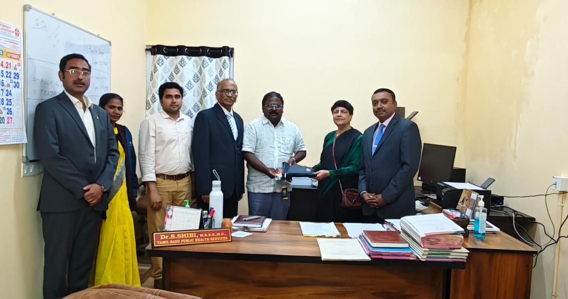 The raincoats and hand gloves were formally handed over by Dr. Ashok Prasad and Dr. Udita Prasad, Trustees of the Dr. P. C. Thomas Foundation, to Mr. Ganesan, Municipal Commissioner, in the presence of Dr. S. Shibi, Municipal Health Officer, and Ms. Vairam, Sanitary Inspector on 17th September 2025.